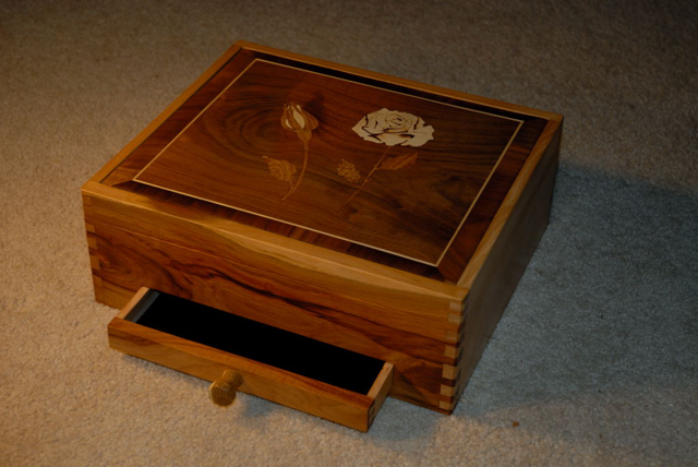 A dovetailed jewel box of arbutus, with rose and rose bud inlay. The inlay is laburnum and holly.