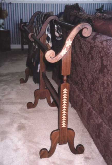 A double length quilt rack of walnut with inlaid holly dogwood flowers and flying geese, a quilter's motif.