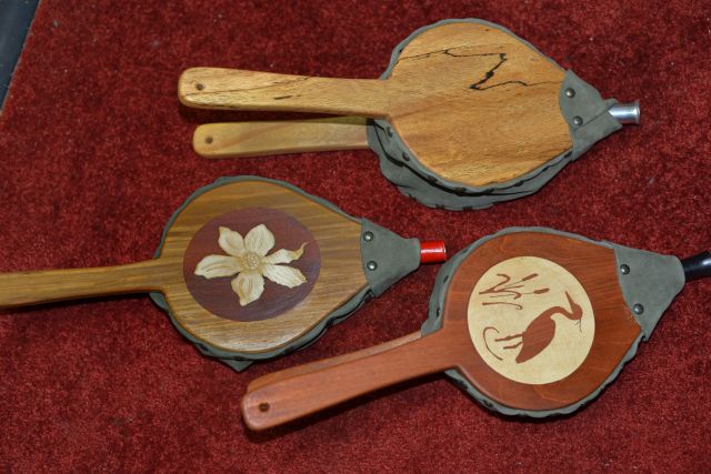 Fireplace Bellows are of various woods, such as pine, arbutus, Garry oak. Inlays shown are