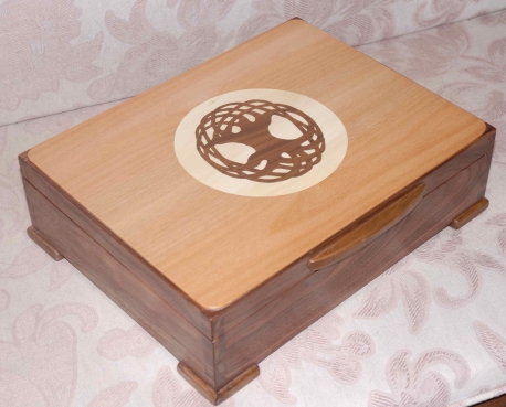 A box commissioned to hold a collection of old pocket watches. The box is arbutus with an alder top panel. The Celtic tree-of-life inlay is cut from walnut and set into holly.