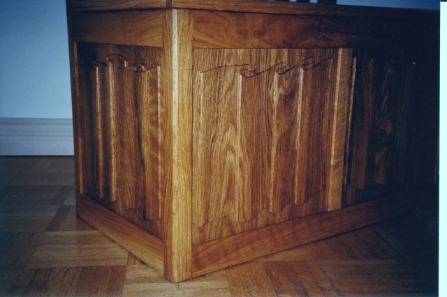 A hall bench in white oak with linen-fold carved panels.