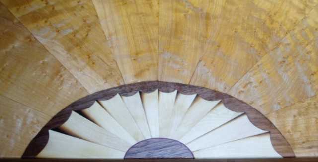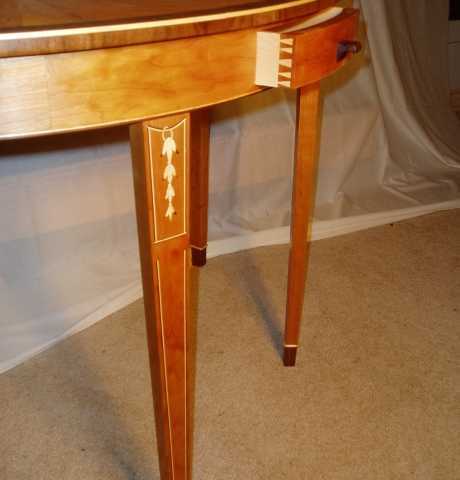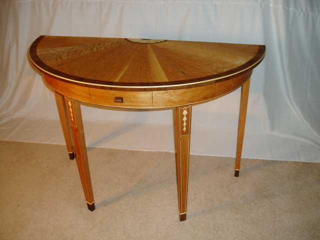 Demi-lune hall table, of cherry, with holly and walnut inlays. A Chippendale design, with added Federal bell-flower motifs on the legs. Bird's eye maple veneer top. (3 views)