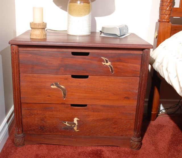 are smaller versions of the fluted columns and carved pineapples. The gull inlays are similar to those on the headboard,