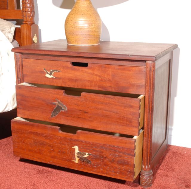 These bedside cabinets are also made of planchonia, to match the pencil-post bed. The columns at the sides of the drawers