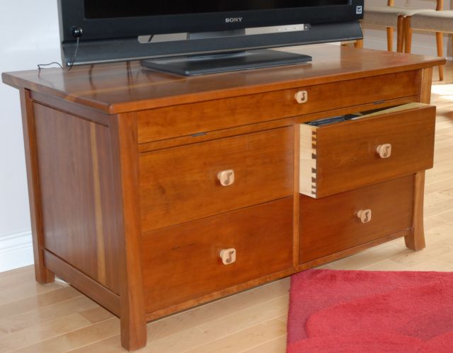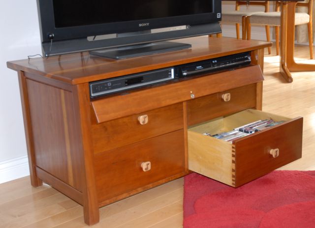 wired to the cable box. The drawers hold DVDs. The drawer pulls have a simple musical note inlaid, reflecting the client's interests.