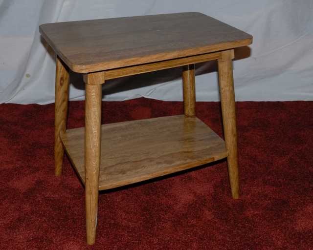 Trapezoidal coffee table in white oak. Slightly splayed legs and lower shelf. Top is slightly tapered from rectangle.