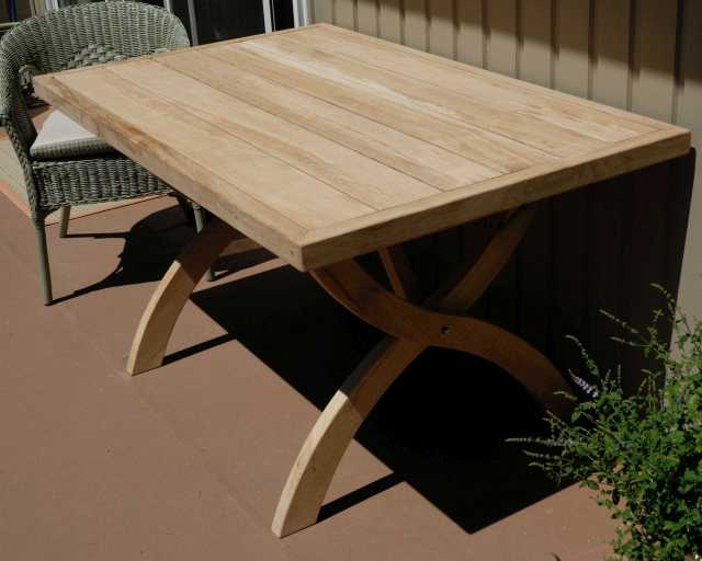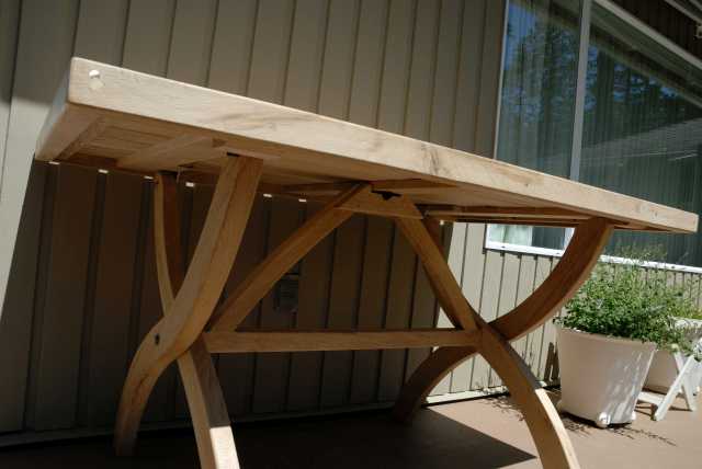 Folding patio table of Garry oak, following a Lee Valley design and hardware. It is heavy and solid.