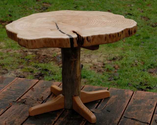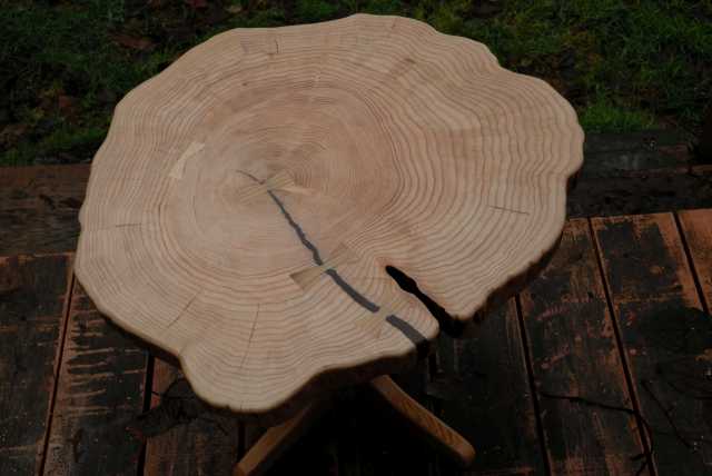 Live-edge coffee table from a disk of Douglas fir 77 years old. The top is about 24 inches diameter, height 18 inches. At about 55 years old, the tree suddenly grew faster; perhaps other trees were cut down giving more light.