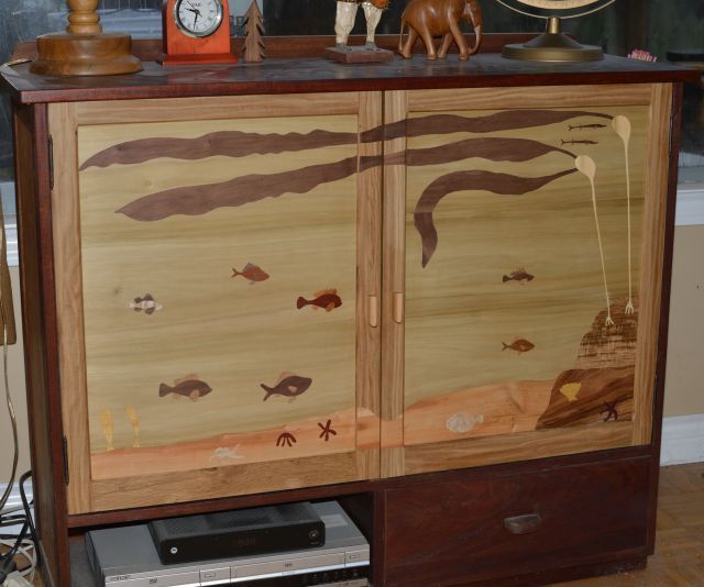 shop sawn veneers, 2 to 3 mm thick and glued to plywood to create an ocean scene. The green ocean is poplar, the sand bottom is arbutus,