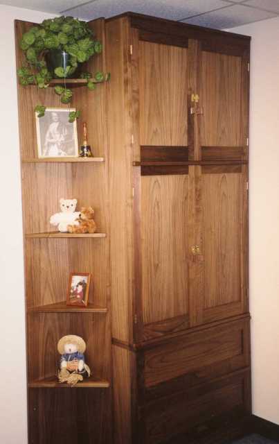 Bookcase and filing cabinet: Walnut plywood construction, with two filing cabinet drawers below shelving, for a local school principal's office.