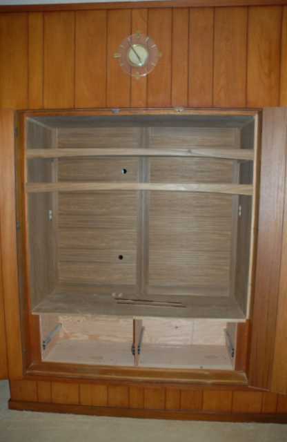 Entertainment renovation: Small spaces for speakers and TV replaced by room for a large TV and stereo equipment. Teak ply and solid construction.