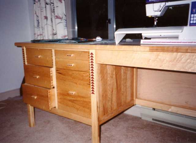 Sewing table: Eastern maple with panels veneered with bird's eye maple. Purple heart "flying geese" motif of quilters.