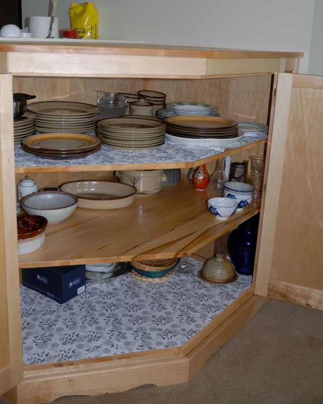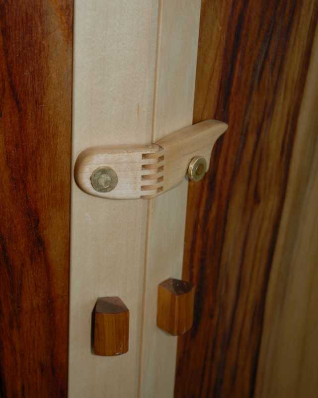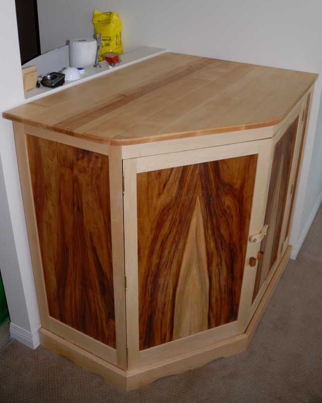 Dining room cabinet of eastern maple with side and door panels of book-matched camphor wood veneer. Cabinet was fitted for an apartment space. Cabinet doors met at an angle requiring a designed latch.