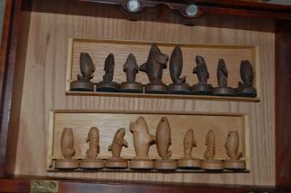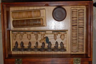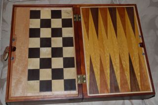 The checkerboard and backgammon board playing surfaces are holly, walnut, cherry, amarello, bird's eye maple.