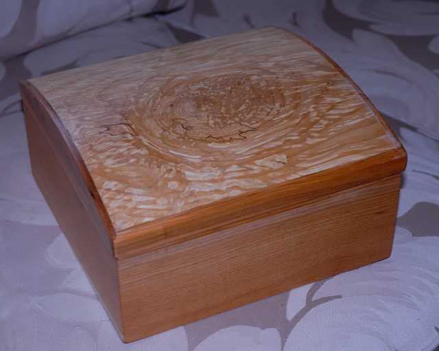 Small box of Pacific Yew with coopered lid and spalted alder top.